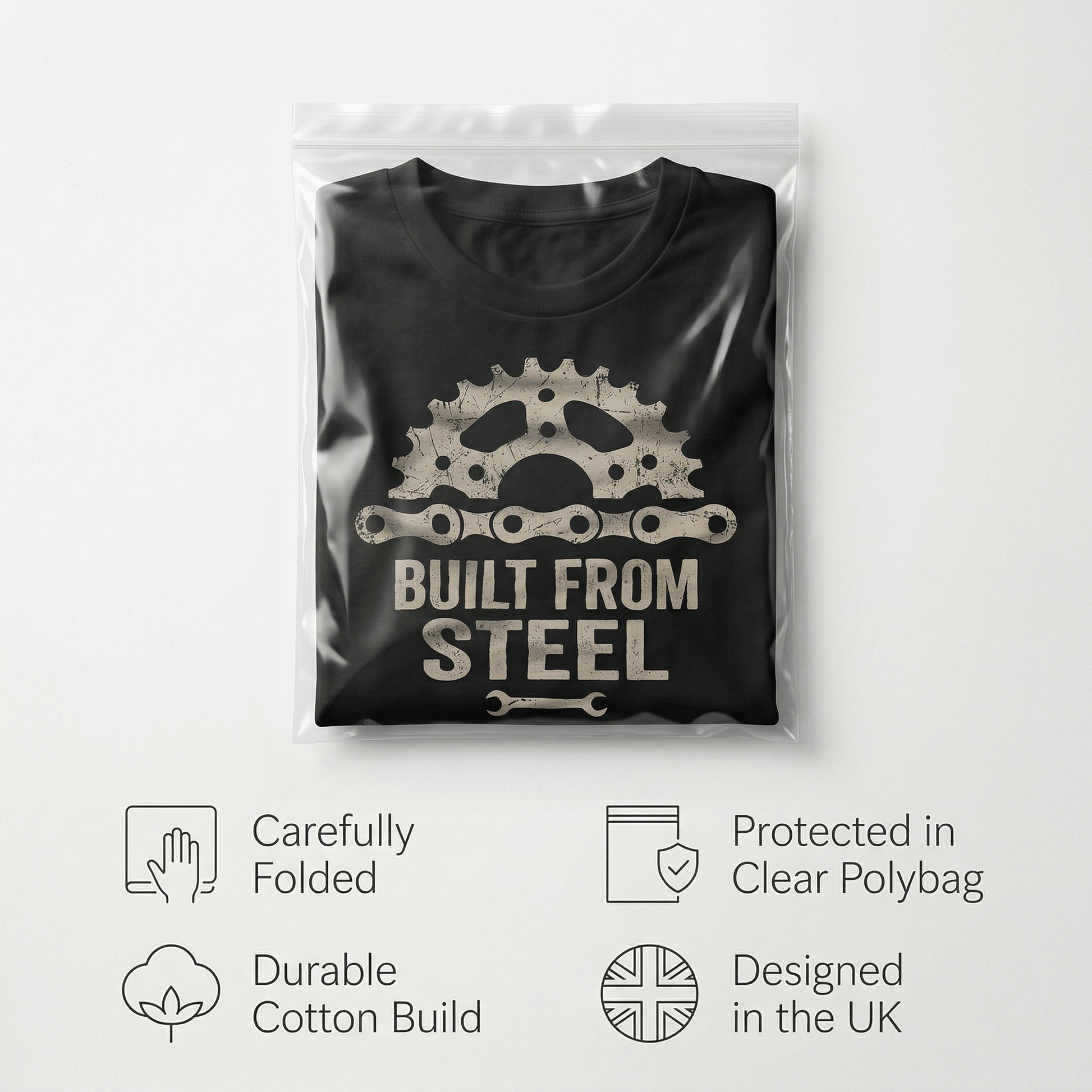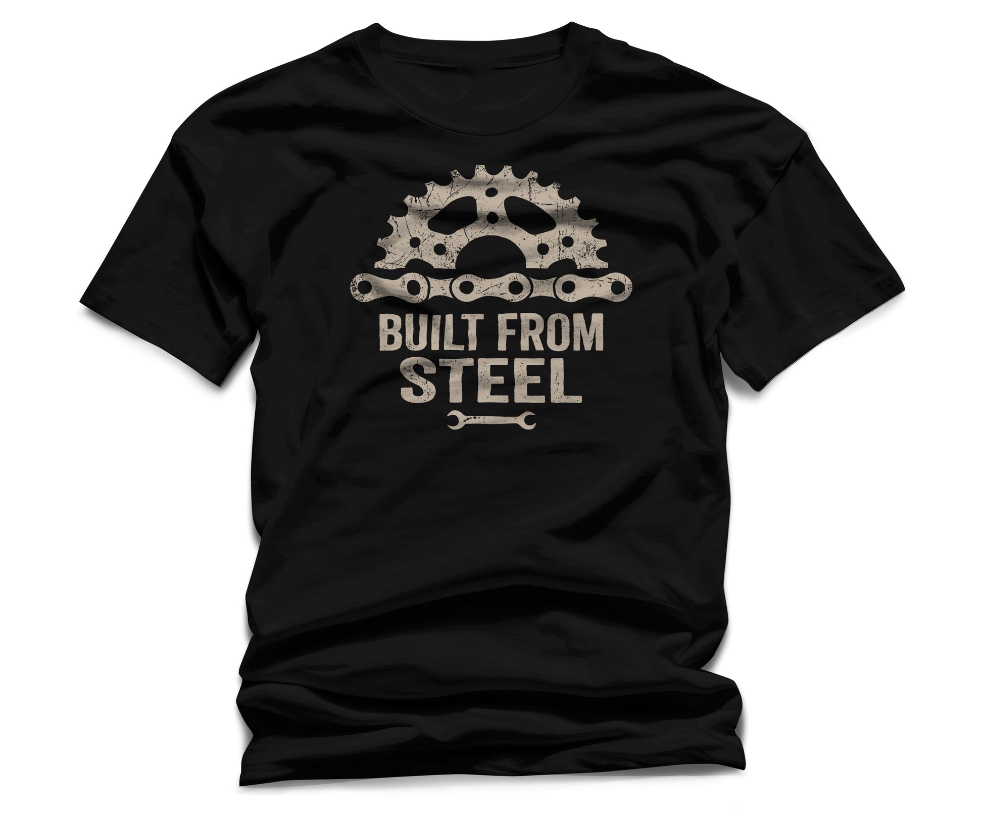 Built From Steel celebrates the mechanical beauty of cycling and the resilience it takes to push through. The design features authentic bike components – a vintage chainring gear, detailed bike chain links, and a mechanic's wrench – all rendered in distressed beige tones against deep black cotton.