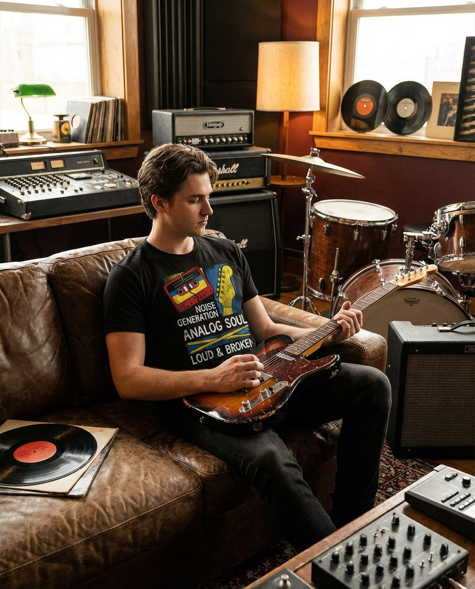 The Design: Raw & Rebellious This graphic screams attitude. Featuring a broken cassette tape, a battered electric guitar headstock, and drumsticks, it captures the chaos of a garage jam session. The bold primary colors (red, yellow, blue) and the gritty slogan "ANALOG SOUL - LOUD & BROKEN" give it an authentic 90s grunge and punk rock aesthetic.