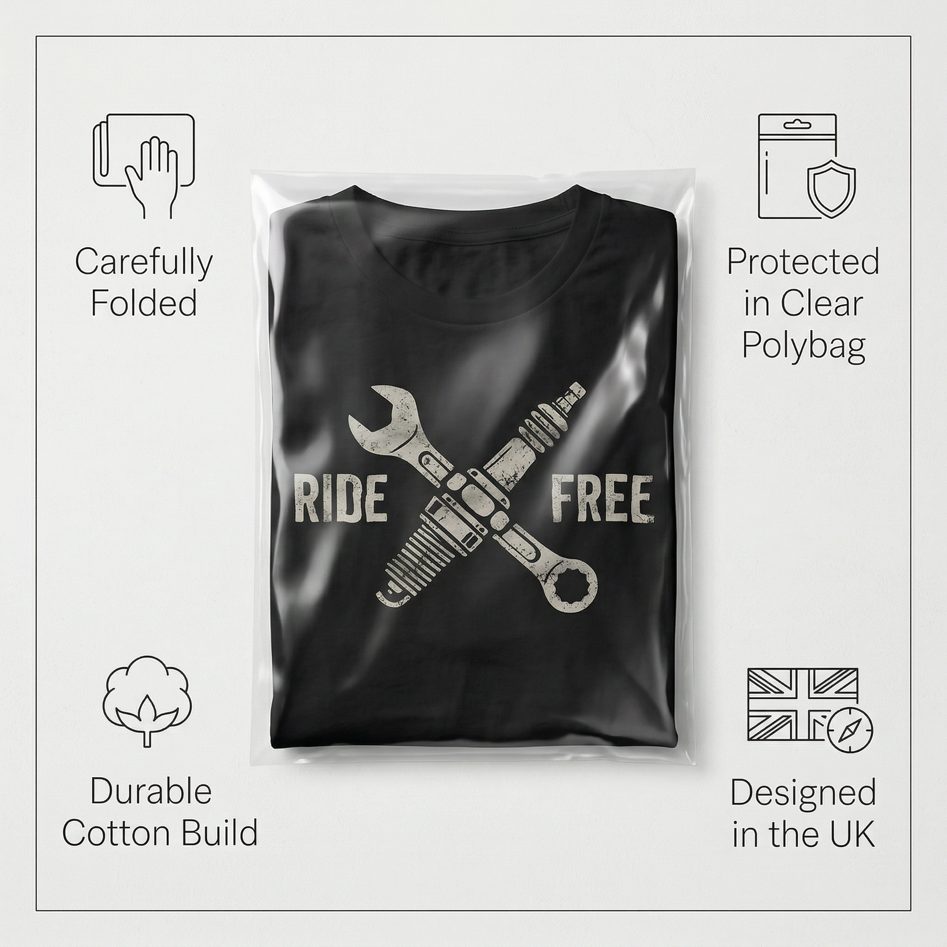 This black unisex tee features a bold distressed graphic with a crossed wrench and spark plug, paired with the strong phrase RIDE FREE. The design has a rugged workshop feel with a clean vintage edge, making it perfect for everyday wear, bike meets, garage sessions, road trips, or as a gift for someone who lives life one ride at a time.